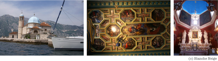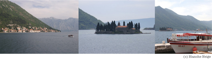 ペラスト村 コルト海に浮かぶ海辺のマドンナ(二つ並ぶ教会) http://medi-terra.net/cities/yugo/perast.html